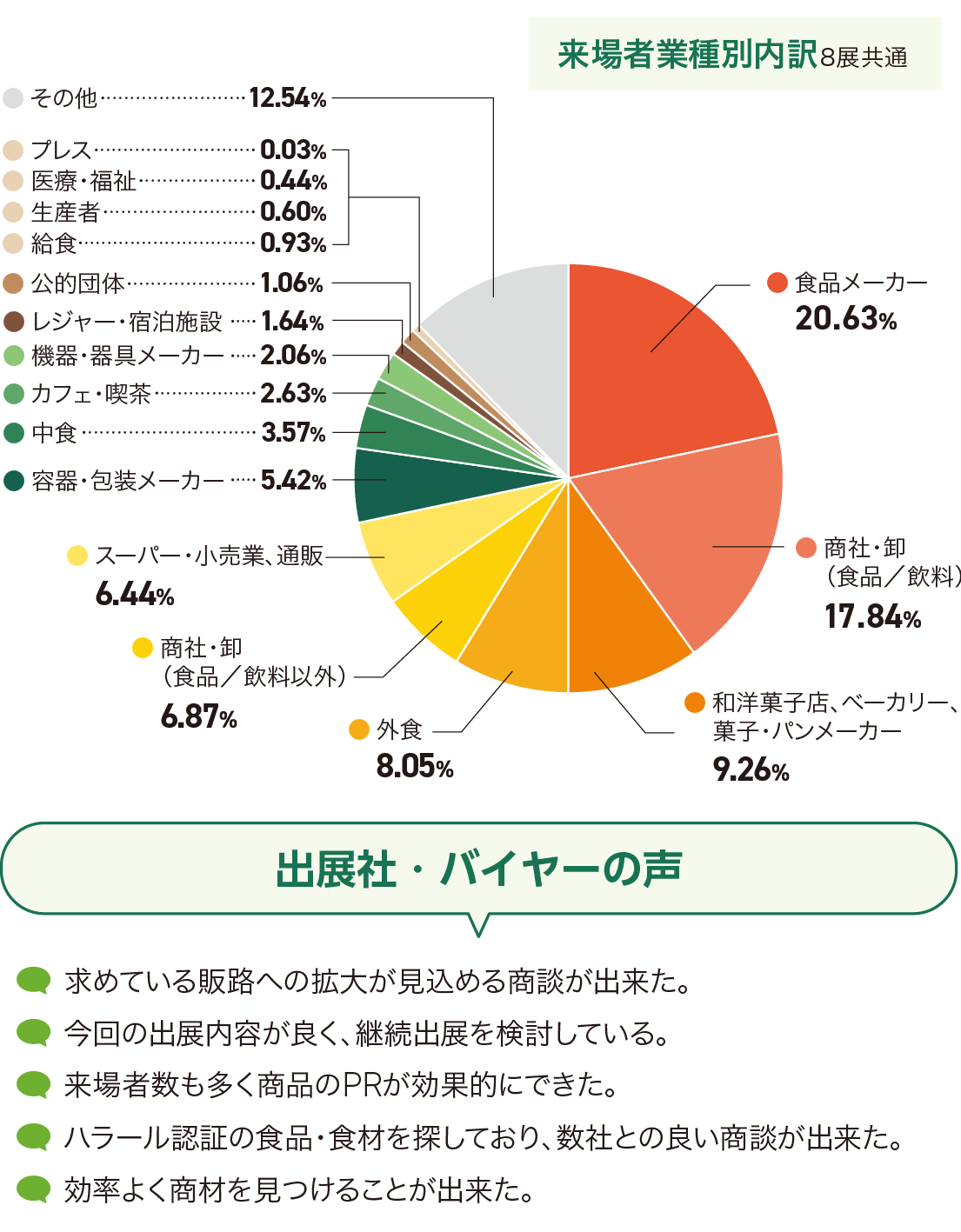 テーマ性の高い最新の食品トレンドを提案する展示会のため、目的意識を持った食関連バイヤーが多数来場します。新たなビジネスチャンスの創出はもちろん、専門的なバイヤーを通じて、フィードバックや市場ニーズを把握することができます。