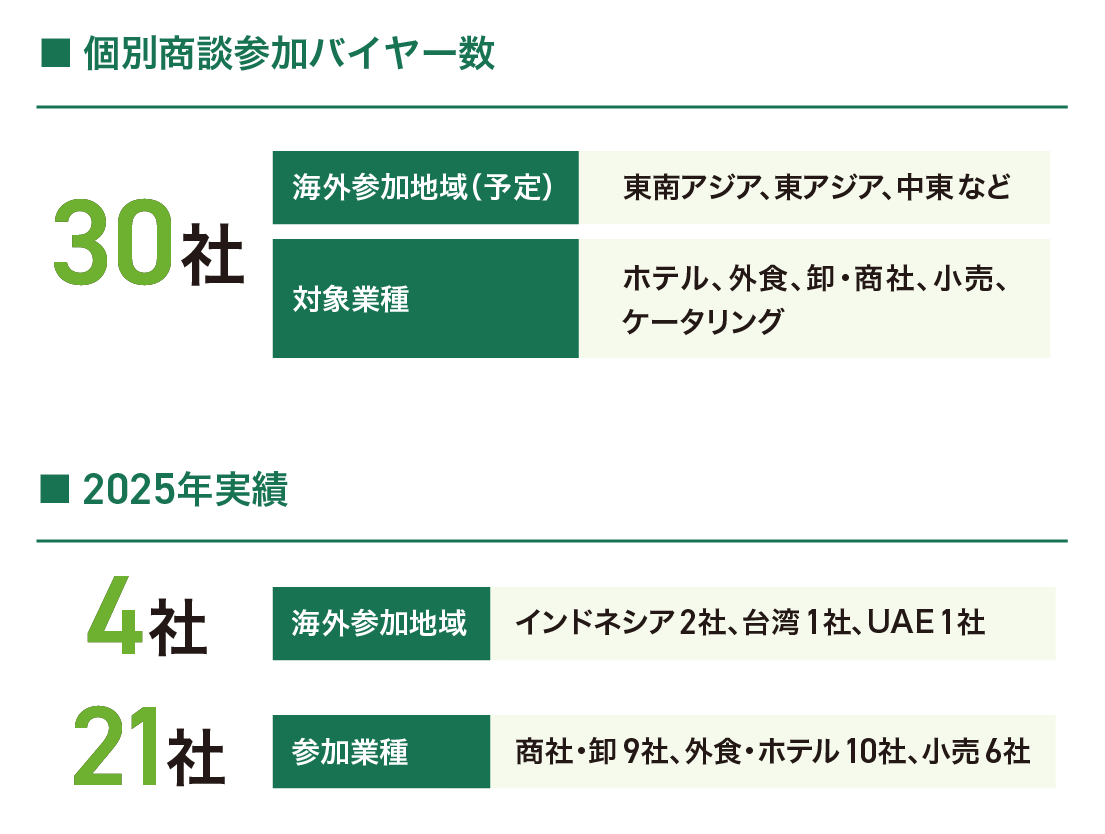 会期中は個別商談会を連日開催。前回は食の多様性に取り組む国内の宿泊施設、飲食店、商社等に加え、海外のインポーター、小売、飲食店を招聘し、国内外の有力バイヤーと約180件の商談が行われました。国内市場拡大、海外展開を実現する絶好の機会です。